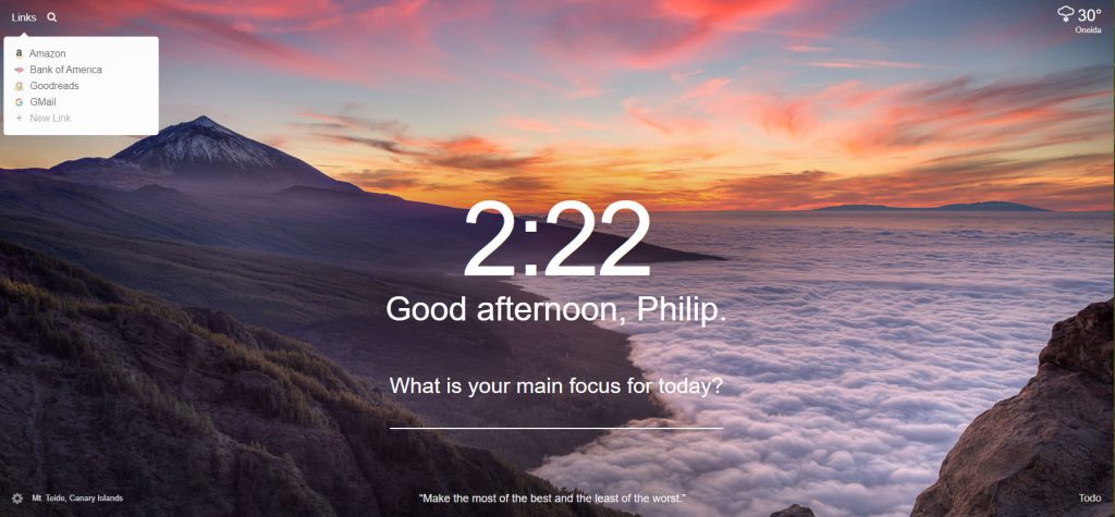 But once I have found what I think is the best software, there is something really great about getting back to it. For awhile I have been using the Brave browser built in homepage. Don’t get me wrong, I like Brave, but the Momentum dashboard has always been my favorite. It gives you a calming, beautiful backdrop, informs you of the time and weather, and gives you quick access to your top used sites. Throw in a little quote at the bottom that I sometimes glance at. I finally reenabled it today and I am glad.